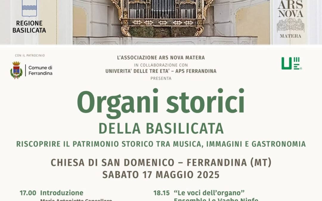 Sabato 17 maggio 2025 alle ore 17,00 nella chiesa di san Domenico a Ferrandina (MT) nuovo appuntamento della rassegna “Organi di Basilicata – Riscoprire il patrimonio regionale tra musica, immagini e gastronomia”, organizzato dall’associazione Ars Nova Matera. L’evento è realizzato in collaborazione con l’Università delle Tre Età APS di Ferrandina, con la Condotta Slow Food di Matera, la disponibilità e collaborazione di Mons. Pierdomenico Di Candia, e con il patrocinio del Comune di Ferrandina. L’obiettivo è quello di valorizzare l’organo storico presente nella chiesa di San Domenico – splendida costruzione settecentesca adiacente all’omonimo convento -, la storia del luogo e le tradizioni gastronomiche locali. L’organo di San Domenico, datato 1777, sarà illustrato dall’organaro Nicola Canosa, consigliere dell’Ars Nova.