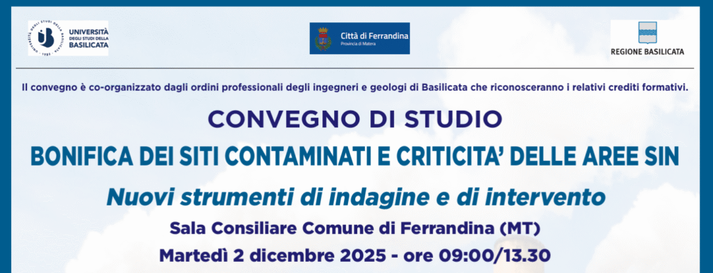 Martedì 2 dicembre 2025, dalle ore 09:00 alle 13:30, nella Sala Consiliare del Comune di Ferrandina, si terrà il convegno di studi “Bonifica dei Siti Contaminati e Criticità delle Aree SIN: Nuovi strumenti di indagine e di intervento”.