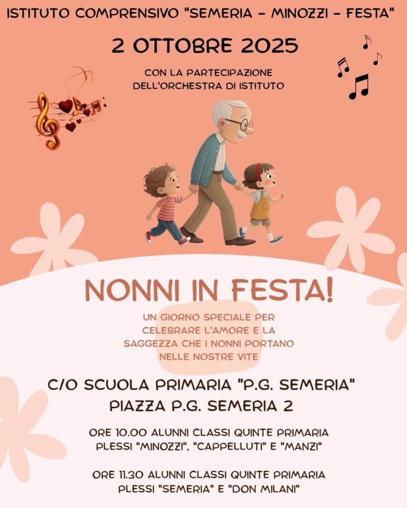 Si terrà il 2 ottobre prossimo, a suggello dell’inizio del nuovo anno scolastico 2025/26, la Festa dei Nonni presso l’Istituto Comprensivo “Semeria-Minozzi-Festa” di Matera. L’evento, trasformato in un toccante concerto, sarà un significativo momento di condivisione intergenerazionale, unendo in un unico abbraccio di armonie alunni, docenti, e in special modo i nonni, veri pilastri della comunità.
