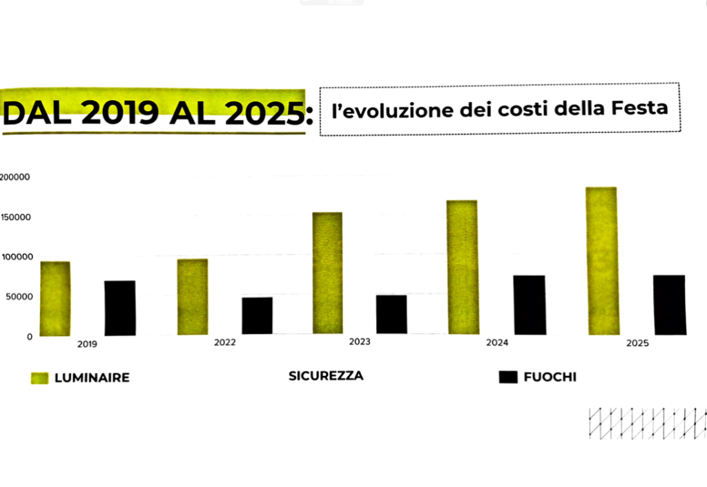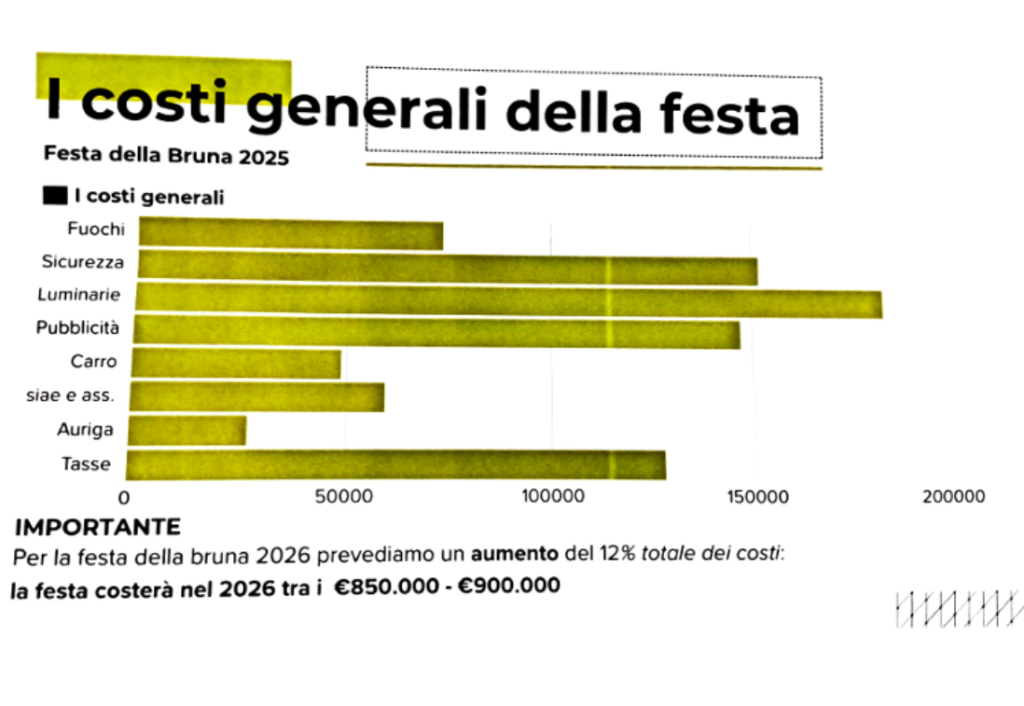 Dal 2019 al 2025 i costi sostenuti per l’organizzazione della festa della Bruna sono passati da 517.714 a 817.360 euro mentre i ricavi da 521.751 a 818,360 euro: 1000 euro in più che simboleggiano un bilancio in attivo, “un bilancio che l’Associazione si sforza di gestire con oculatezza. – aggiunge Caiella – Siamo davvero orgogliosi e un grazie va soprattutto ai soci e al mondo giovanile: vantiamo infatti un elevato numero di ragazzi con grandi professionalità e una formazione universitaria di eccellenza che mettono volontariamente a disposizione le loro competenze. Un ringraziamento particolare anche alla Giunta comunale che, senza nessuna pressione da parte nostra, ha anticipato il contributo della Regione”.