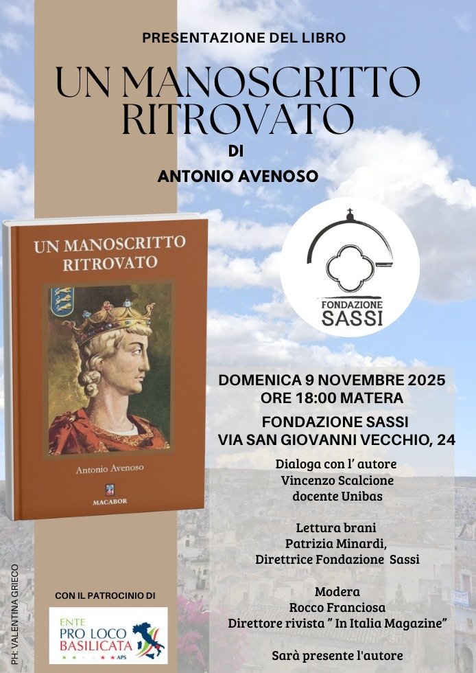 Un antico manoscritto, un segreto che attraversa i secoli e una storia che torna a parlare al presente. È il cuore del nuovo libro di Antonio Avenoso, “Un manoscritto ritrovato”, che sarà presentato domenica 9 novembre, alle ore 18.00, presso la sede della Fondazione Sassi in via San Giovanni Vecchio 24 a Matera.