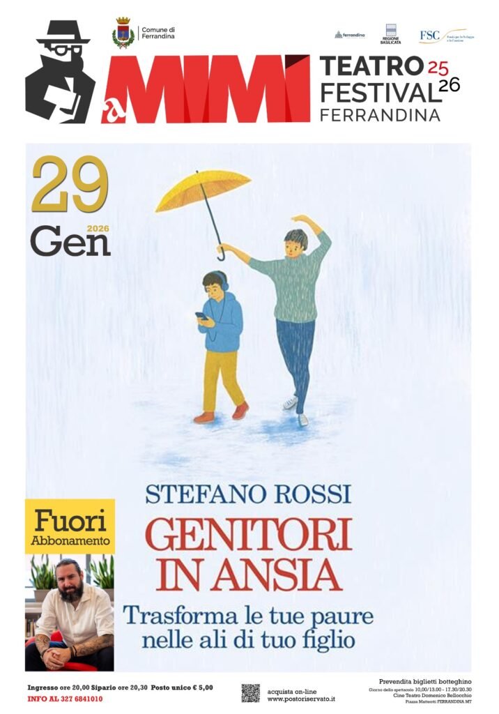Giovedì 29 gennaio , la stagione del Teatro Festival Ferrandina – A Mimì apre una parentesi di profonda riflessione dedicata al sociale e all’educazione. Il Cineteatro Bellocchio ospiterà lo psicopedagogista Stefano Rossi per la conferenza dal titolo: “GENITORI IN ANSIA – Trasforma le paure nelle ali di tuo figlio”.