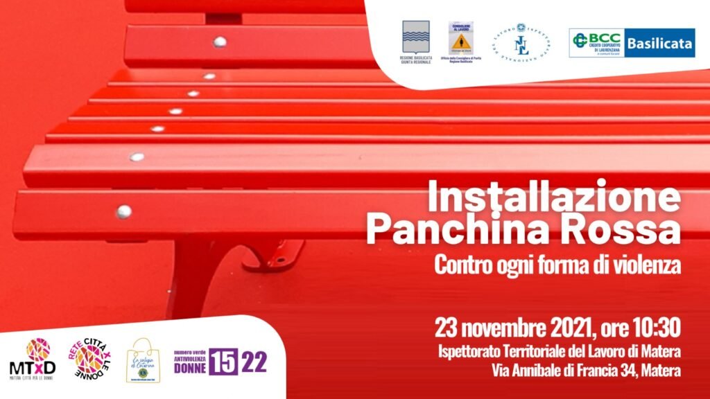La mattina alle ore 10.30, sarà installata la “Panchina rossa contro ogni forma di violenza” con targa portante il numero verde antiviolenza 1522. La panchina sarà posta a Matera in via Annibale di Francia, nel piazzale antistante la sede dell’Ispettorato territoriale del Lavoro. L’Iniziativa è frutto di una attività sinergica tra l’ufficio della Consigliera di parità regionale e l’Ispettorato regionale del lavoro volta alla prevenzione e contrasto delle discriminazioni di genere sui posti di lavoro. Ha un valore altamente simbolico, anche alla luce della recente ratifica della Convenzione Oil (Legge n. 4/2021) sul contrasto alla violenza e alle molestie sui luoghi di lavoro; si vuol così ricordare le tante vittime di femminicidio ed offrire un servizio segnalando il numero verde antiviolenza che, se attivato, può salvare la vita di una donna.