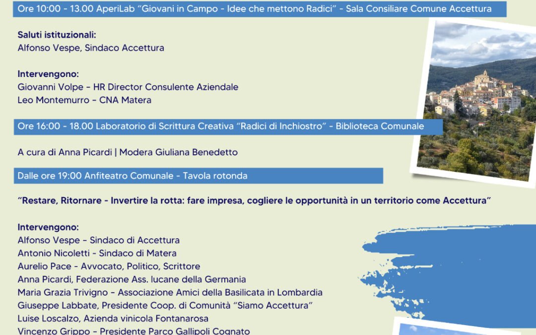 Alle ore 19.00 nell’anfiteatro comunale si terrà la tavola rotonda “Restare, Ritornare – Invertire la rotta”, un dibattito tra istituzioni, imprenditori e attori del territorio sulle opportunità di fare impresa in un territorio come Accettura.