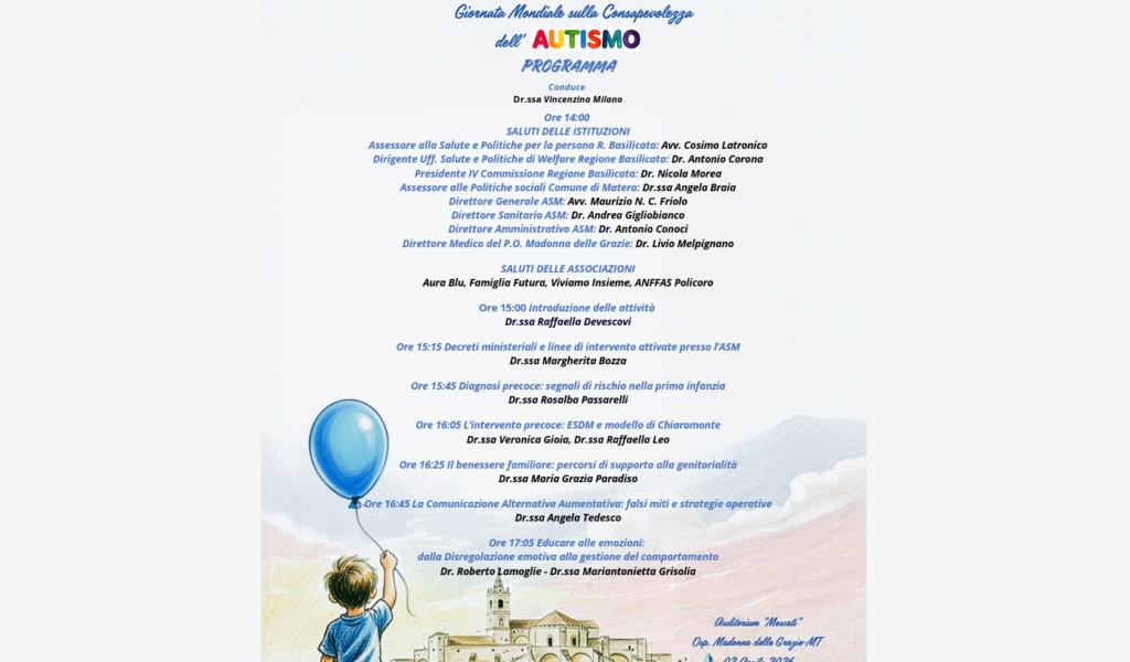 In occasione della Giornata Mondiale per la Consapevolezza sull’Autismo, che si celebra il 2 Aprile, l’Azienda Sanitaria Locale di Matera organizza un incontro dedicato alla promozione dell’inclusione e alla condivisione delle esperienze cliniche e assistenziali maturate all’interno dell’Unità Operativa Complessa di Neuropsichiatria Infantile.