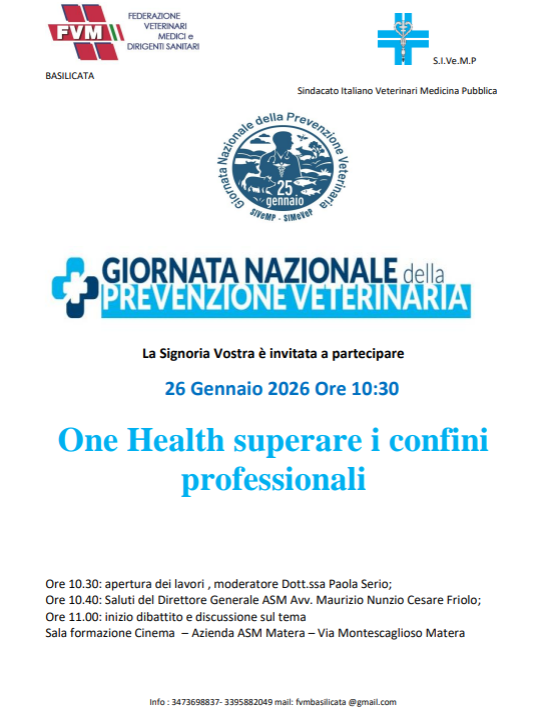 In occasione di tale evento, lunedì 26 gennaio, a partire dalle ore 10 e 30, nella Sala Cinema dell’Azienda Sanitaria Locale di Matera, in via Montescaglioso, si terrà un’Assemblea dal titolo “One Health superare i confini professionali” promossa dal Sindacato Italiano Veterinari Medicina Pubblica e dalla Federazione Veterinari Medici e Dirigenti Sanitari. Ad aprire i lavori sarà il direttore generale dell’ASM, Maurizio Friolo.