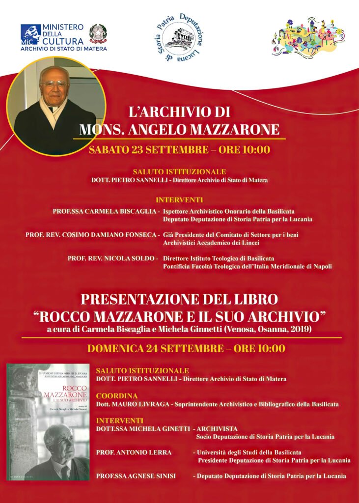 Domenica 24 settembre – ore 10.00: presentazione del libro “Rocco Mazzarone e il suo archivio”, a cura di Carmela Biscaglia e Michela Ginnetti (Venosa, Osanna, 2019)