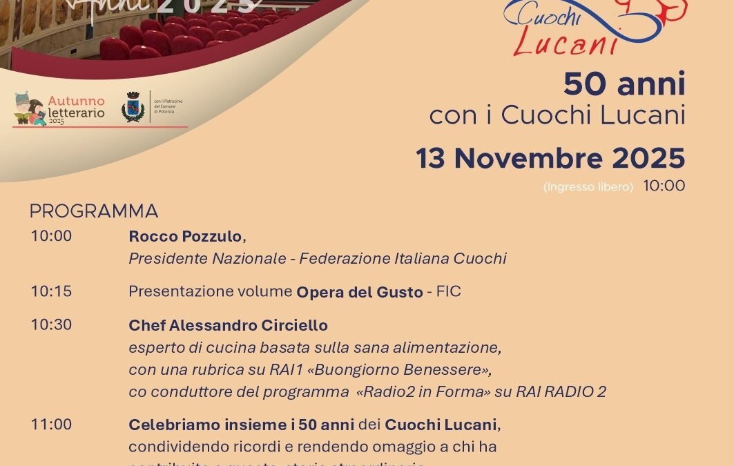 Compie cinquant’anni l’Unione regionale cuochi lucani. Un evento che sarà celebrato a Potenza, giovedì 13 novembre, al teatro “Stabile” a partire dalle ore 10. Ad aprire la giornata di festa, presentata da Lorenzo Lo Basso, conduttore della trasmissione televisiva “Agorà Estate”, sarà la presentazione del libro “L’opera del gusto’ , il primo ricettario Fic alla presenza di Rocco Cristiano Pozzullo, lucano e presidente nazionale della Federazione italiana cuochi. Seguiranno i ringraziamenti ufficiali a quanti hanno contribuito a far crescere, a partire dal 1975, l’ Unione regionale: i fondatori , i presidenti che si sono succeduti nel tempo, i presidenti provinciali di Potenza, Matera e Melfi, e tutte le figure istituzionali che nel corso degli anni hanno collaborato , creduto e aiutato a cresce il progetto. Per l’occasione si ricorderanno anche i successi dei cuochi lucani membri Nic della Basilicata e i team manager e si ringrazieranno i collaboratori esterni all’Unione e i presidenti di altre associazioni di categoria. Speciali riconoscimenti saranno assegnati ai soci che hanno avuto successo in trasmissioni televisive nazionali e sui canali social e a tutti i membri dell’attuale consiglio regionale dei Cuochi Lucani e dei vari compartimenti. Ospite della giornata sarà Alessandro Circiello, opinion leader, esperto di alimentazione e ideatore della figura del cuoco come promotore di salute . A chiudere la mattinata sarà il ricordo del preside Umberto Di Pasca alla presenza degli altri dirigenti degli istituti alberghieri della regione. un momento dedicato alle celebrazioni , ma anche agli incontri tra i soci. “ Il mio augurio e quello di tutto il direttivo dell’Unione è che tutti i soci fondatori o i loro familiari partecipino in tanti all’evento – evidenzia Antonio Zazzerini, presidente dell’Unione regionale cuochi lucani – perché sarà una grande festa per tutti e per l’unione che negli anni ha raccolto risultati importanti e lusinghieri”.