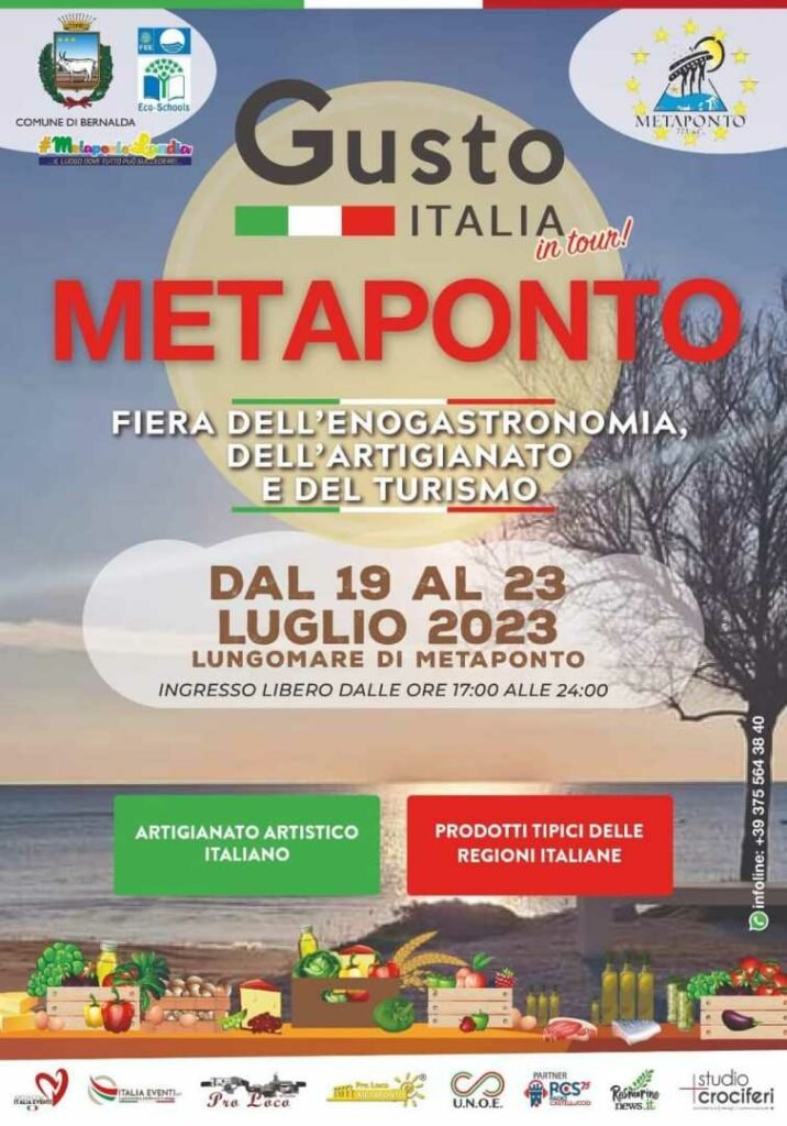 Gusto Italia, evento itinerante firmato dall’Associazione Italia Eventi, è patrocinata dal Comune di Bernalda, grazie al sindaco Domenico Raffaele Tataranno, all’assessore Rocchelia Scarcella e al consigliere Giancarlo Sortiero, dall’Associazione Leucippo Operatori Turistici Metaponto, dalla Pro Loco Metaponto, dalla Pro Loco Bernalda e dall’UNOE, l’Unione Nazionale Organizzatori di Eventi. L’ingresso libero e gratuito prevede un orario di apertura che andrà dalle ore 17 a mezzanotte.