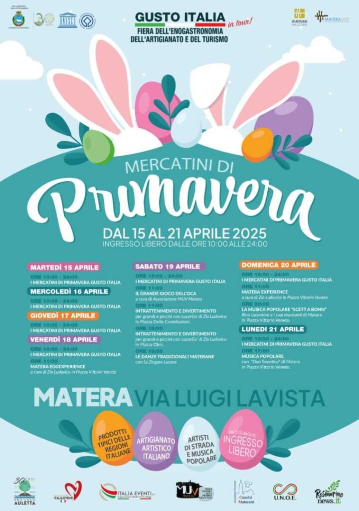 Tipicità, artigianato, spettacoli, laboratori, degustazioni: saranno questi gli ingredienti della seconda tappa di stagione di Gusto Italia. Da martedì 15 a domenica 21 aprile, con un orario di apertura continuativo dalle ore 10 a mezzanotte, i Mercatini di primavera si terranno in Via Luigi La Vista, a ridosso di Piazza Vittorio Veneto. L’affascinante città di Matera, dunque, promette festività pasquali golose e ricche di attività adatte a tutta la famiglia.