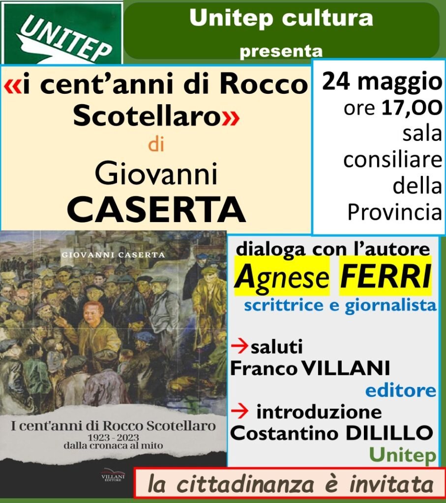 L’Unitep, Università della terza età e della educazione permanente nell’ambito delle celebrazioni dei 100 anni di Scotellaro, promuove un incontro con lo storico e scrittore Giovanni Caserta, autore per Villani editore di “I cent’anni di Rocco Scotellaro -1923-2023 – dalla cronaca al mito”.