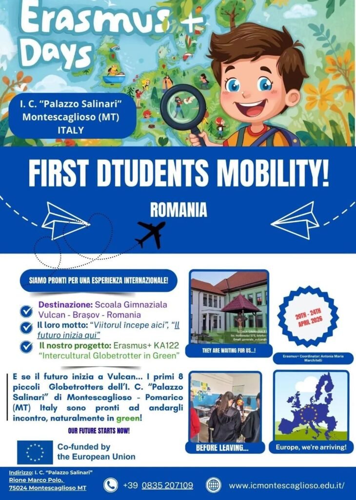 Partono i ragazzi dell’I.C. “Palazzo Salinari” di Montescaglioso–Pomarico per la Romania, accompagnati dai docenti Buonsanti Pietro e Marchitelli Antonia Maria. Si tratta della prima mobilità studenti nell’ambito del progetto Erasmus+ KA122 “Intercultural Globetrotters in Green”, un’esperienza della durata di 5 giorni che segna un traguardo importante per il nostro Istituto.