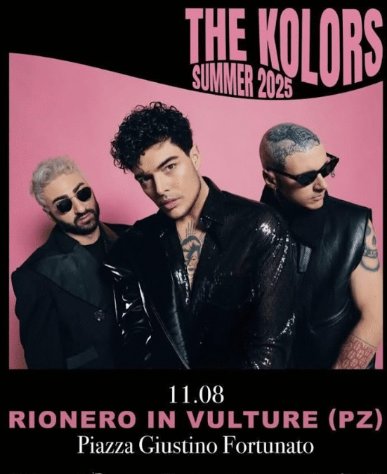 THE KOLORS tornano in Basilicata per uno spettacolo imperdibile: lunedì 11 agosto 2025, a partire dalle ore 22:00, si esibiranno a RIONERO IN VULTURE in Piazza Giustino Fortunato (ingresso libero)