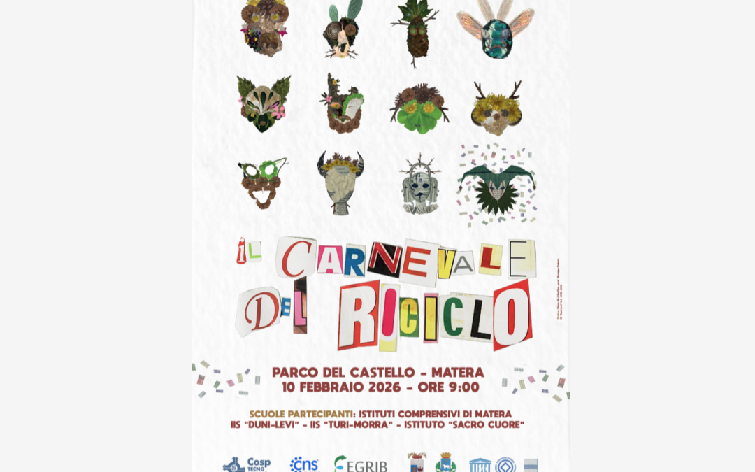 Si svolgerà il 10 febbraio dalle ore 09:00 alle13:00 presso il castello Tramontano di Matera la IV edizione del “Carnevale del Riciclo”. Saranno coinvolti gli studenti degli istituti comprensivi di Matera, il “Duni-Levi”, il Turi- Morra” e il “Sacro Cuore”:
