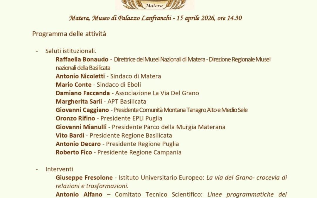 Sostenibilità, identità e sviluppo tra Campania, Basilicata e Puglia il tema del convegno dei Comuni del Partenariato “La Via del Grano Regio Cammino di Matera” in programma il prossimo mercoledì 15 aprile 2026 alle ore 14,30 a Matera presso la sala conferenze del Museo di Palazzo Lanfranchi. Il programma delle attività prevede i saluti istituzionali di Raffaella Bonaudo, Direttrice dei Musei Nazionali di Matera – Direzione Regionale dei Musei nazionali della Basilicata, Antonio Nicoletti, Sindaco di Matera, Mario Conte, Sindaco di Eboli, Damiano Faccenda, Associazione “La Via del Grano”, Margherita Sarli, Direttrice Apt Basilicata, Giovanni Caggiano, Presidente Comunità Montana Tanagro Alto e Medio Sole, Oronzo Rifino, Presidente Ente Pro Loco Italiane Comitato Puglia, Giovanni Mianulli, Presidente Parco della Murgia Materana, Vito Bardi, Presidente della Regione Basilicata, Antonio De Caro, Presidente della Regione Puglia e Roberto Fico, Presidente della Regione Campania. Al centro del convegno moderato da Rocco Franciosa, Presidente Ente Pro Loco Basilicata, che vedrà la presentazione del documento programmatico dell’Associazione La Via del Grano, previste le relazioni di Giuseppe Fresolone, Istituto Universitario Europeo su “La Via del Grano: crocevia di relazioni e trasformazioni” e di Antonio Alfano, Comitato tecnico scientifico “La Via del Grano” su Linee programmatiche del partenariato. A seguire ci sarà il confronto tra le Istituzioni e gli Enti partecipanti con la raccolta delle proposte di integrazione e/o modifiche al documento programmatico e l’invito a nuove adesioni. La “Via del Grano” nasce sotto l’impulso illuminato di Ferdinando IV di Borbone. Verso la fine del XVIII secolo, il Re comprese che per garantire la stabilità sociale di Napoli, ormai metropoli europea, era necessario un sistema di approvvigionamento cerealicolo rapido e sicuro. Per realizzare questa colossale opera infrastrutturale, il Re si affidò al Marchese di Valva, Soprintendente alle Strade del Regno. Fu il Valva a tracciare quel “corridoio della salute” che doveva collegare i fertili territori della Basilicata e della Puglia con la Capitale, trasformando antichi sentieri di transumanza in una moderna arteria commerciale dotata di ponti, taverne ed epitaffi monumentali. Oggi, il progetto promosso dall’Associazione “La Via del Grano” e dal Comune Capofila di Eboli a cui hanno aderito molti comuni lucani, campani e pugliesi, mira a trasformare questo itinerario storico in un Corridoio Turistico di Eccellenza