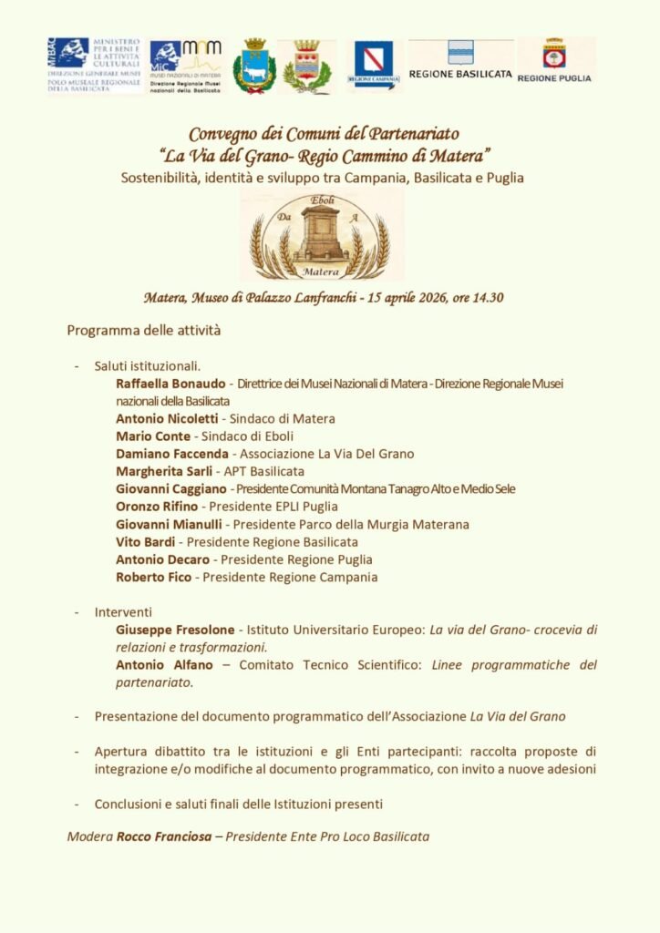Sostenibilità, identità e sviluppo tra Campania, Basilicata e Puglia il tema del convegno dei Comuni del Partenariato “La Via del Grano Regio Cammino di Matera” in programma il prossimo mercoledì 15 aprile 2026 alle ore 14,30 a Matera presso la sala conferenze del Museo di Palazzo Lanfranchi. Il programma delle attività prevede i saluti istituzionali di Raffaella Bonaudo, Direttrice dei Musei Nazionali di Matera – Direzione Regionale dei Musei nazionali della Basilicata, Antonio Nicoletti, Sindaco di Matera, Mario Conte, Sindaco di Eboli, Damiano Faccenda, Associazione “La Via del Grano”, Margherita Sarli, Direttrice Apt Basilicata, Giovanni Caggiano, Presidente Comunità Montana Tanagro Alto e Medio Sole, Oronzo Rifino, Presidente Ente Pro Loco Italiane Comitato Puglia, Giovanni Mianulli, Presidente Parco della Murgia Materana, Vito Bardi, Presidente della Regione Basilicata, Antonio De Caro, Presidente della Regione Puglia e Roberto Fico, Presidente della Regione Campania. Al centro del convegno moderato da Rocco Franciosa, Presidente Ente Pro Loco Basilicata, che vedrà la presentazione del documento programmatico dell’Associazione La Via del Grano, previste le relazioni di Giuseppe Fresolone, Istituto Universitario Europeo su “La Via del Grano: crocevia di relazioni e trasformazioni” e di Antonio Alfano, Comitato tecnico scientifico “La Via del Grano” su Linee programmatiche del partenariato. A seguire ci sarà il confronto tra le Istituzioni e gli Enti partecipanti con la raccolta delle proposte di integrazione e/o modifiche al documento programmatico e l’invito a nuove adesioni. La “Via del Grano” nasce sotto l’impulso illuminato di Ferdinando IV di Borbone. Verso la fine del XVIII secolo, il Re comprese che per garantire la stabilità sociale di Napoli, ormai metropoli europea, era necessario un sistema di approvvigionamento cerealicolo rapido e sicuro. Per realizzare questa colossale opera infrastrutturale, il Re si affidò al Marchese di Valva, Soprintendente alle Strade del Regno. Fu il Valva a tracciare quel “corridoio della salute” che doveva collegare i fertili territori della Basilicata e della Puglia con la Capitale, trasformando antichi sentieri di transumanza in una moderna arteria commerciale dotata di ponti, taverne ed epitaffi monumentali. Oggi, il progetto promosso dall’Associazione “La Via del Grano” e dal Comune Capofila di Eboli a cui hanno aderito molti comuni lucani, campani e pugliesi, mira a trasformare questo itinerario storico in un Corridoio Turistico di Eccellenza