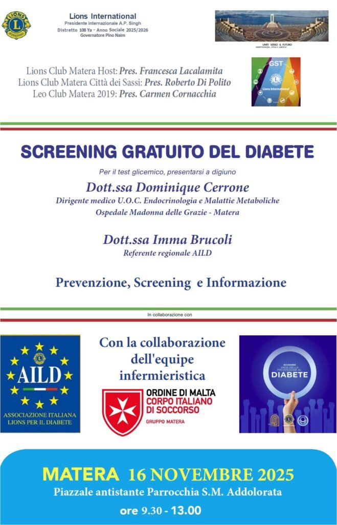 Domenica 16 novembre dalle ore 9,30 alle ore 13:00 il Lions Club Matera Host, il Lions Club Matera Città dei Sassi e il Leo Club 2019 hanno organizzato, nel piazzale antistante la Parrocchia Maria SS. Addolorata di Matera, lo screening gratuito del diabete a cui potranno partecipare tutti i cittadini che lo vorranno.