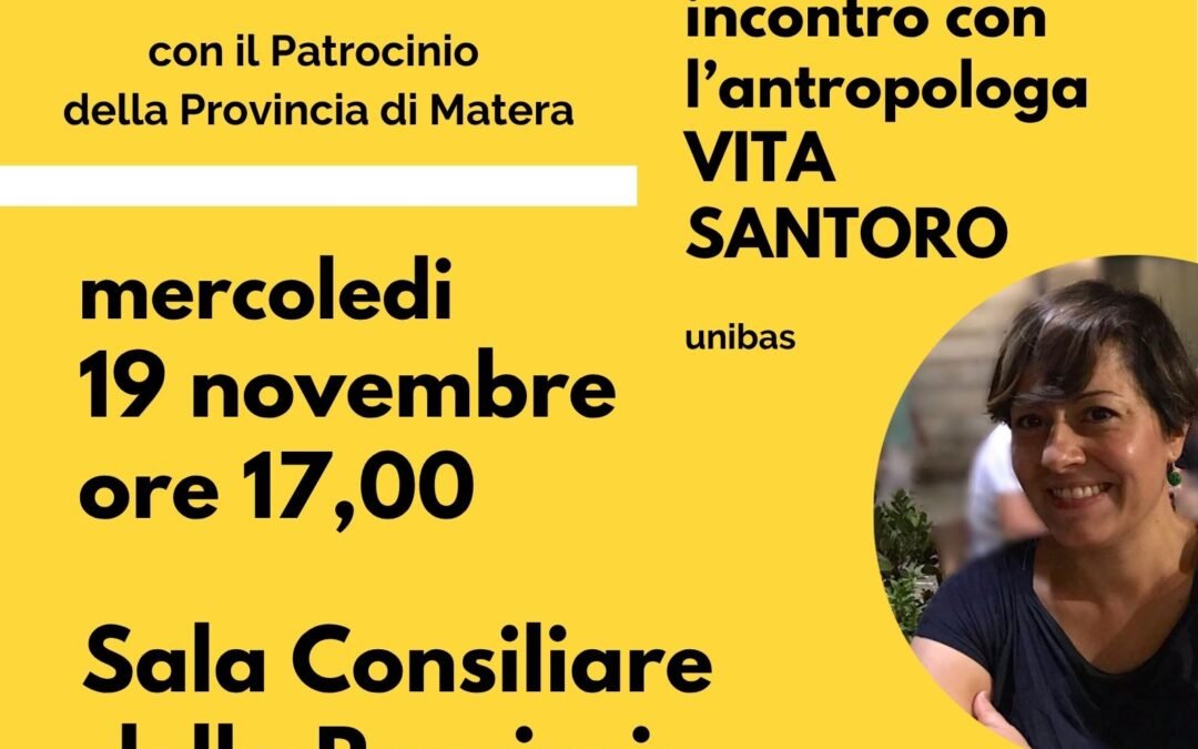 Vita Santoro, antropologa, e PhD (il più alto titolo accademico nelle nostre università), è docente e ricercatrice all’Università della Basilicata. Coordina progetti europei sul patrimonio culturale immateriale e ha condotto ricerche etnografiche in Basilicata, tra cui lo studio delle memorie degli ex abitanti dei Sassi. È vicepresidente di SIMBDEA e membro di SIAC e SIEF. I suoi interessi includono antropologia del patrimonio, museale, della scrittura, delle migrazioni e delle maschere. Ha pubblicato articoli e due volumi recenti: Scrivere le culture (2023) e Sassi e Memoria (2023). Quest’ultima interessantissima opera esplora l’importanza di raccogliere e conservare le testimonianze orali degli abitanti di Matera, valorizzando i ricordi personali come parte integrante della memoria collettiva.