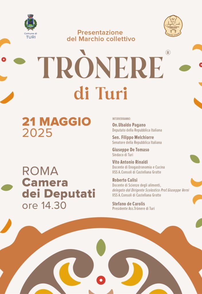 Appuntamento di grande rilievo per la promozione delle eccellenze pugliesi: mercoledì 21 maggio, alle ore 14.30, nella Sala Stampa della Camera dei Deputati, si terrà la cerimonia di presentazione del marchio collettivo “TRÒNERE di TURI”.