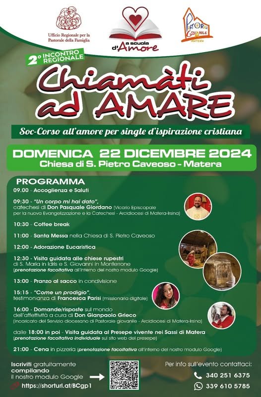 Appuntamento domenica 22 dicembre a Matera, nel cuore dei Sassi, presso la Chiesa di San Pietro Caveoso, per il secondo incontro regionale dei single di ispirazione cristiana: “Chiamàti ad amare. Soc-corso all’amore”.