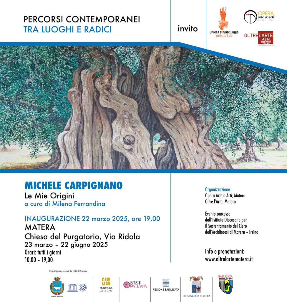 Sabato 22 marzo 2025 alle ore 19:00, si inaugura la mostra personale del maestro Michele Carpignano “Le Mie Origini”, organizzata dalla galleria Opera Arte e Arti in collaborazione con la cooperativa Oltre l’Arte presso la Chiesa del Purgatorio a Matera.