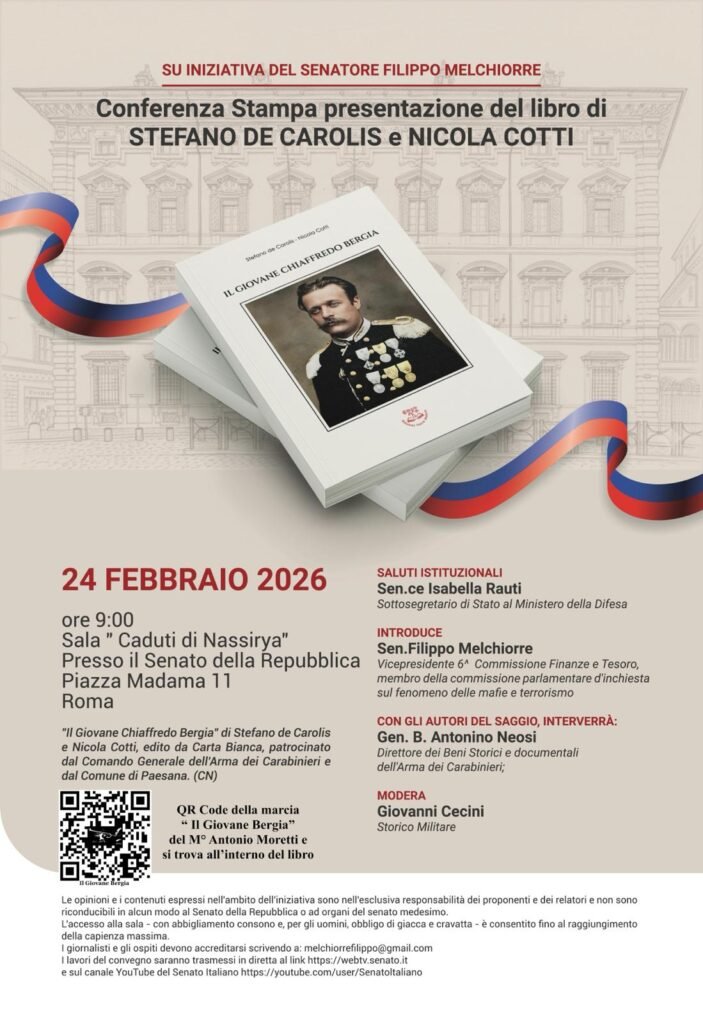 Martedì 24 febbraio 2026, alle ore 9.00, la Sala “Caduti di Nassiriya” del Senato della Repubblica (Piazza Madama 11, Roma) ospiterà la conferenza stampa per la presentazione del libro “Il giovane Chiaffredo Bergia” di Stefano de Carolis e Nicola Cotti, edito da Carta Bianca.