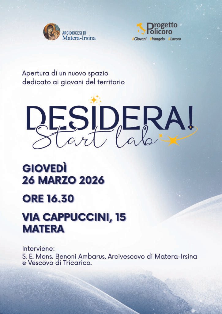 Giovedì 26 marzo alle ore 16:30 nella sede della Caritas diocesana di Matera-Irsina in Via Cappuccini 15 a Matera, sarà inaugurato DESIDERA! Start Lab,lo spazio del Progetto Policoro diocesano per i giovani.