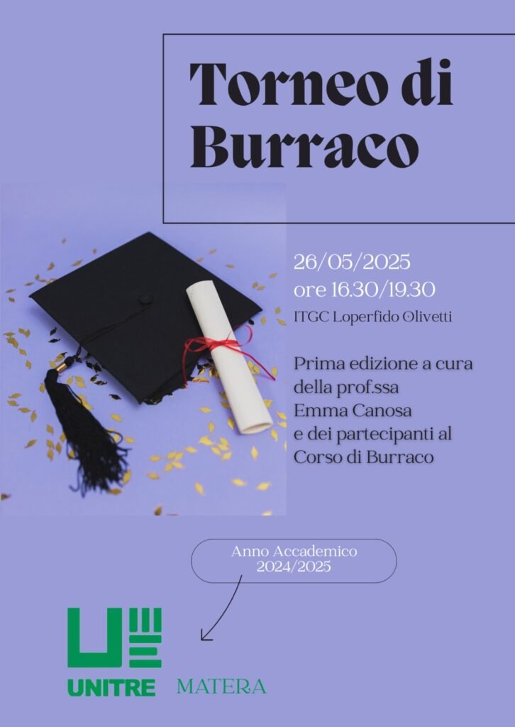 Lunedì, dalle ore 16.30 alle 19.30, nella sede dell’ITGC “Loperfido-Olivetti” Matera, si terrà la prima edizione del Torneo di Burraco della Unitre Matera. A conclusione del Corso di Burraco, guidato dalla docente Emma Canosa, che ha visto una larga partecipazione degli iscritti all’associazione, si svolgerà il primo Torneo di Burraco organizzato dall’ Unitre materana. La gara si svolgerà secondo le regole proprie di questo interessante e coinvolgente gioco. È previsto un unico premio consistente in un certificato su pergamena attestante la vittoria del vincitore; tutti i partecipanti riceveranno in omaggio un oggetto realizzato dagli stessi corsisti. Una buona occasione per mettere a frutto le conoscenze apprese durante questo Anno Accademico, che si avvia alla conclusione, e per trascorrere insieme un pomeriggio in piacevole compagnia.