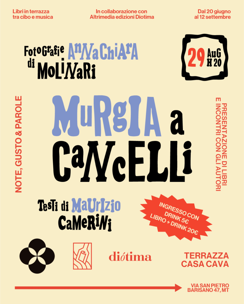 Venerdì 29 agosto 2025 alle ore 20 sulla terrazza di Casa Cava nei Sassi di Matera sarà presentato Murgia a cancelli (Altrimedia Edizioni), il volume con fotografie di Annachiara Molinari e testi di Maurizio Camerini per il cartellone estivo di Libri in terrazza “Note, Gusto & Parole”.