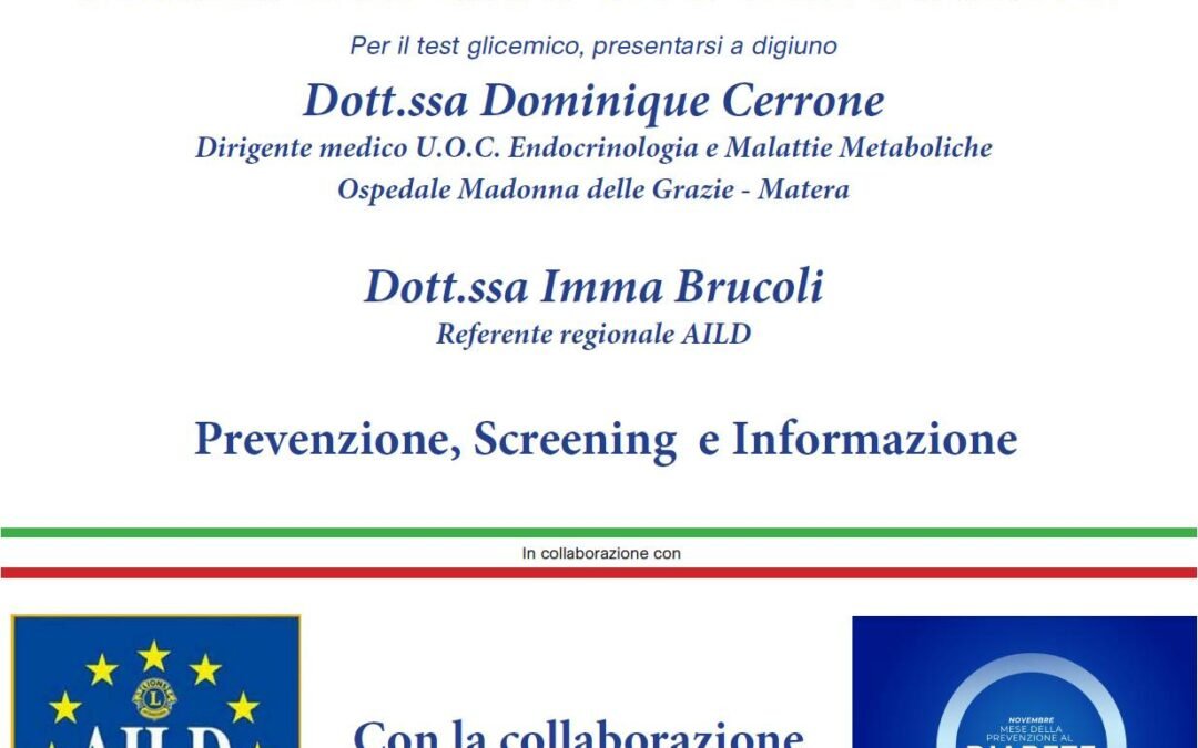 I Lions Club Matera Host, Matera Città dei Sassi e Leo Club Matera 2019, in collaborazione con l’Associazione Italiana Lions per il Diabete AILD, domenica 29 ottobre dalle ore 9,30 alle ore 13 nel piazzale antistante la Parrocchia Maria SS. Addolorata di Matera, effettueranno lo screening gratuito del diabete a cui potranno aderire tutti i cittadini che lo vorranno.