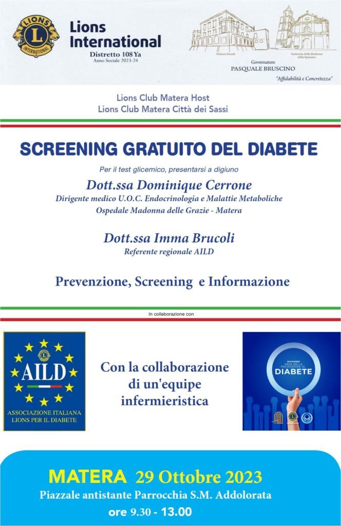 I Lions Club Matera Host, Matera Città dei Sassi e Leo Club Matera 2019, in collaborazione con l’Associazione Italiana Lions per il Diabete AILD, domenica 29 ottobre dalle ore 9,30 alle ore 13 nel piazzale antistante la Parrocchia Maria SS. Addolorata di Matera, effettueranno lo screening gratuito del diabete a cui potranno aderire tutti i cittadini che lo vorranno.