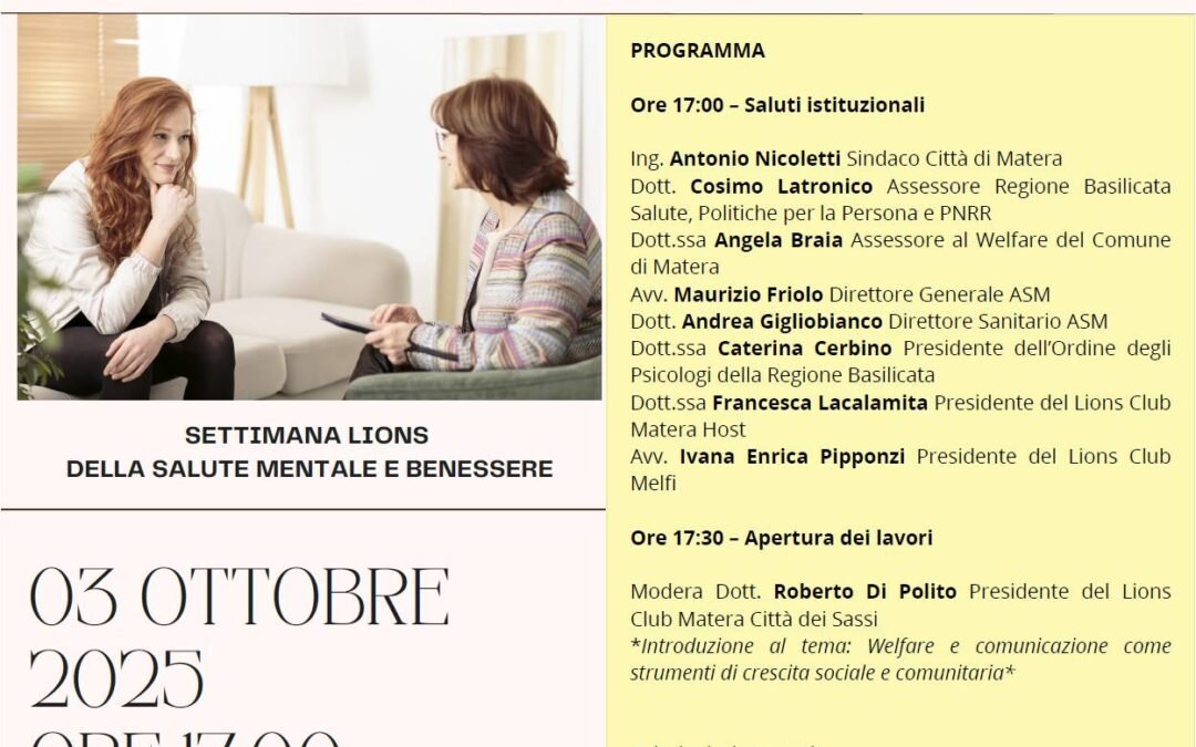 Promosso dai Lions Club Matera Città dei Sassi, Matera Host e Melfi, nell’ambito della Settimana Lionistica “Salute mentale e benessere” (4–12 ottobre 2025), si svolgerà il 3 ottobre 2025 alle ore 17 presso la Sala Mandela del palazzo comunale di Matera un convegno sul tema “Welfare e comunicazione”. AIl’incontro parteciperanno i presidenti dei club organizzatori rispettivamente Roberto Di Polito, Francesca Lacalamita e Ivana Pipponzi. Si ringraziano per la collaborazione l’Assessorato al Welfare del Comune di Matera, la Rete Donna e l’Ordine Regionale degli Psicologi della Basilicata per il patrocinio morale.