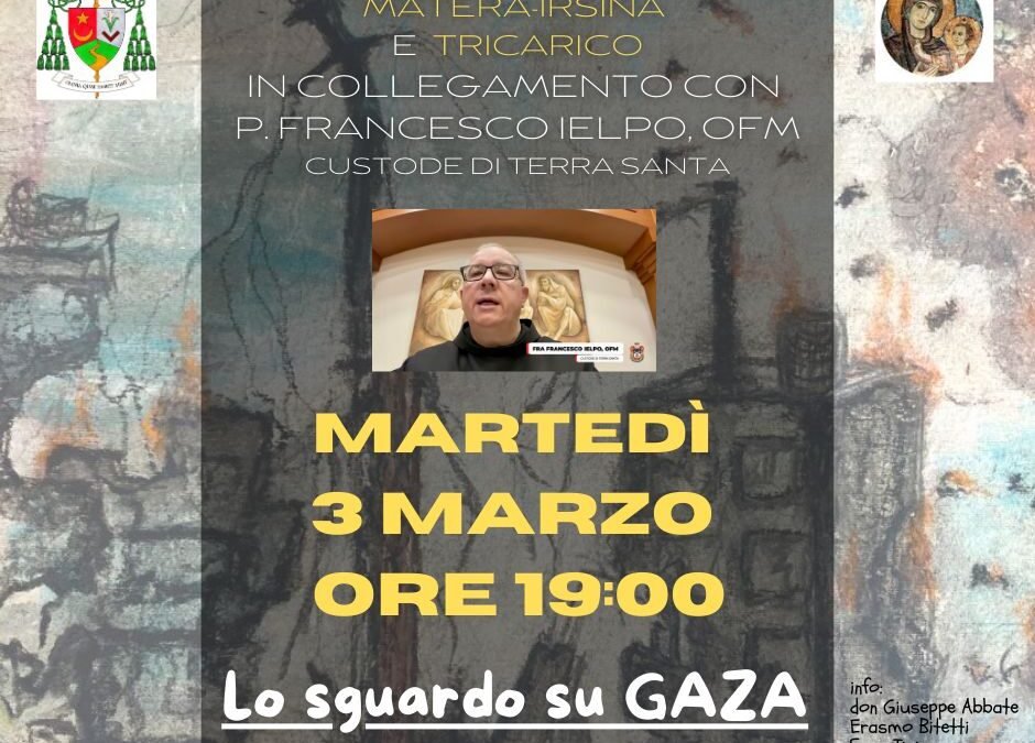 Le Diocesi di Matera-Irsina e di Tricarico, guidate dal vescovo S.E. Mons. Benoni Ambarus, promuovono un incontro online aperto alle comunità diocesane e a tutti i fedeli che desiderano comprendere più da vicino la realtà che si vive oggi in Terra Santa.