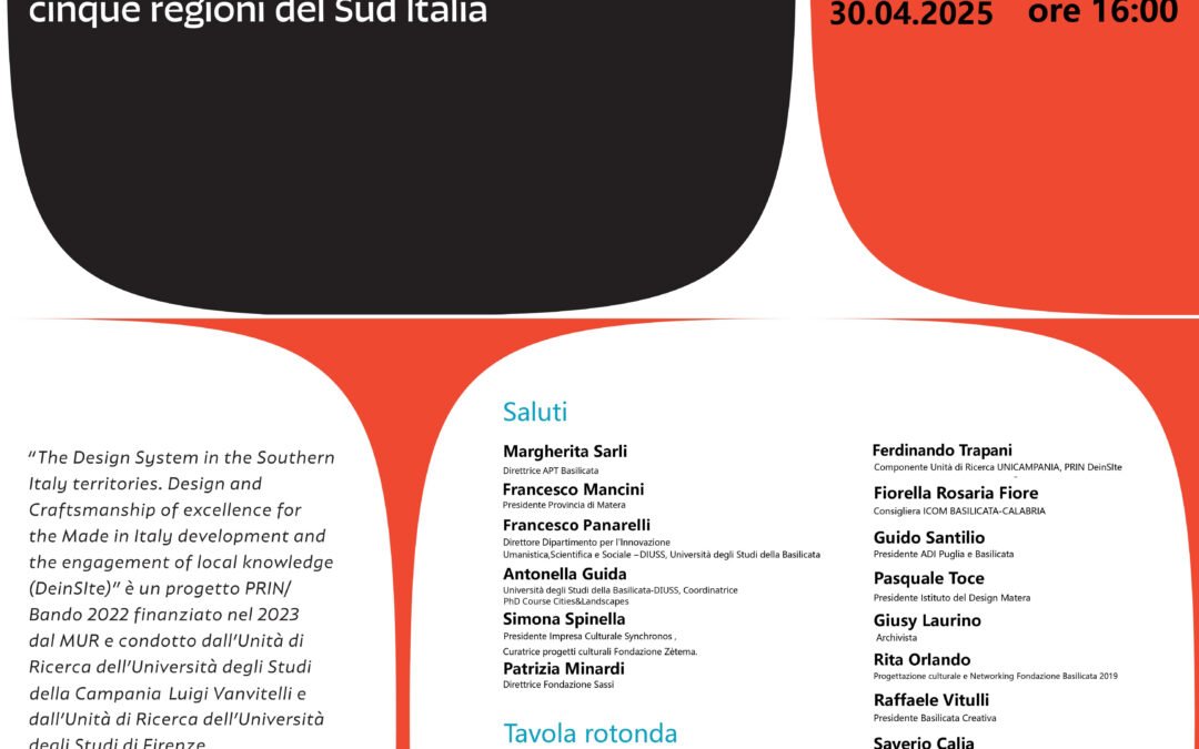 Mercoledì 30 aprile 2025, alle ore 16:00, presso l’Open Space dell’APT in Piazza Vittorio Veneto a Matera, si presenterà il progetto PRIN/Bando 2022 “The Design System in the Southern Italy territories. Design and Craftsmanship of excellence for the Made in Italy development and the engagement of local knowledge (DeinSIte)”, finanziato nel 2023 dal MUR. Il progetto, condotto dall’Unità di Ricerca dell’Università degli Studi della Campania “Luigi Vanvitelli (UNICAMPANIA) e dall’Unità di Ricerca dell’Università degli Studi di Firenze (UNIFI), ha avuto il supporto di SYMBOLA Fondazione per le qualità italiane, dell’Associazione MUSEIMPRESA, della Fondazione Donnaregina per le arti contemporanee | Museo Madre e della Fondazione PLART.