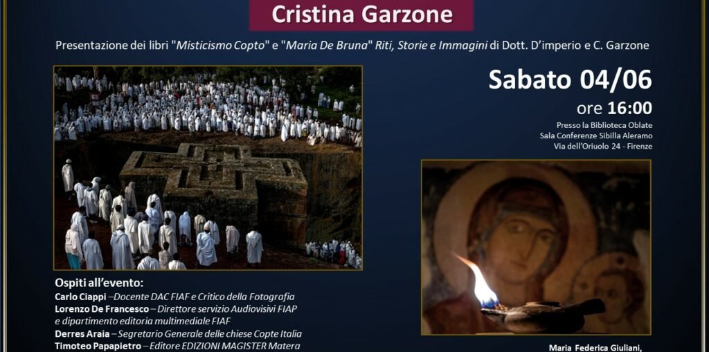 Sabato 4 giugno alle 16, nella Sala Conferenze Sibilla Aleramo della Biblioteca delle Oblate di Firenze, a cura del Gruppo Fotografico Il Cupolone APS saranno presentati i libri di “Misticismo copto” di Cristina Garzone e “Maria De Bruna. Riti, storie e immagini” di Nicola D’Imperio e Cristina Garzone.