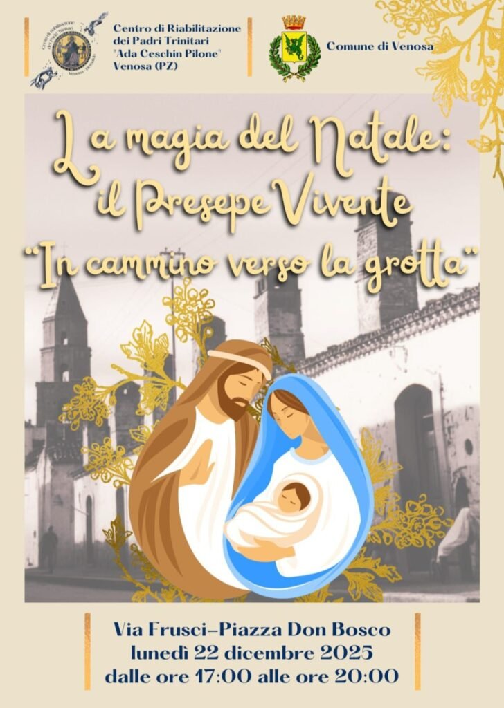 Si intitola “Il cammino verso la grotta”, il Presepe Vivente promosso dai Padri Trinitari di Venosa, in programma lunedì 22 dicembre, dalle ore 17 alle 20, nel cuore del centro storico della città d’Orazio. Un evento natalizio che va oltre la tradizionale rappresentazione, trasformandosi in un appuntamento di emozioni, creatività e spettacolo, capace di unire teatro, musica e fede per rievocare la Natività. Protagonisti dell’iniziativa, gli ospiti del centro di riabilitazione dei Padri Trinitari, che saranno parte attiva nel percorso narrativo e simbolico del presepe. L’evento si svilupperà in un tratto di strada che va da via Frusci a piazza Don Bosco, dove ha sede la struttura dei Padri Trinitari. Lungo via Frusci, sette abitazioni a pianoterra saranno trasformate in botteghe artigianali, animate dagli ospiti del centro, che – indossando costumi ispirati al presepe – mostreranno al pubblico i manufatti e le competenze acquisite nei vari laboratori didattici, fra cui quelli di pelletteria, cucina, falegnameria o cartapesta. Il percorso culminerà in piazza Don Bosco, nel giardino dei Padri Trinitari, dove sarà allestita la capanna della Natività, fulcro spirituale dell’intera rappresentazione. Ad allietare l’evento, le note della “Banda senza problemi”, il gruppo musicale dei Padri Trinitari. L’iniziativa rientra nella programmazione natalizia dell’amministrazione comunale di Venosa e coinvolge operatori, responsabili e ospiti della struttura, in una serata di inclusione e condivisione aperta alla comunità. I Padri Trinitari, infatti, invitano tutta la cittadinanza, i residenti dei comuni limitrofi e i turisti presenti a Venosa nel periodo natalizio a partecipare a questo cammino simbolico verso la grotta, un’occasione per vivere il Natale all’insegna della solidarietà e della speranza.