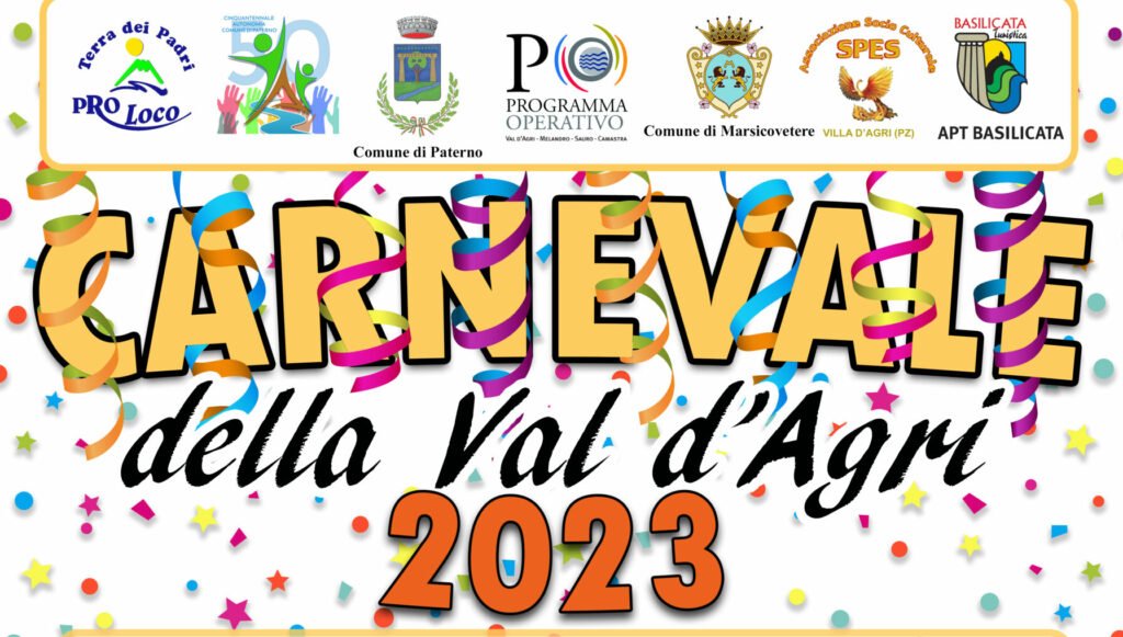 Prove di promozione culturale e territoriale congiunta e di branding turistico comprensoriale grazie alla sinergia tra Paterno e Marsicovetere, in occasione del Carnevale 2023, messa in campo dalle rispettive Amministrazioni comunali, dalla Pro Loco ‘Terra dei Padri’ di Paterno, dall’Associazione socio-culturale ‘Spes’ di Villa d’Agri e dal Comitato Giovani di Marsicovetere.