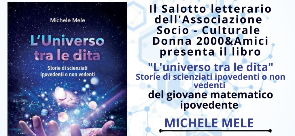 Sabato 19 Novembre 2022 alle ore 18 il salotto Letterario dell’Associazione Donna 2000&Amici di Ferrandina – Calata San Domenico – ex liceo – ospiterà per la presentazione del suo libro “L’Universo tra le dita” il matematico ipovedente Michele Mele, ricercatore matematico il cui motto di vita è “fare delle necessità una virtù.