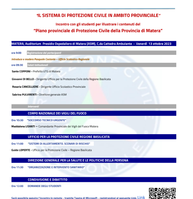 Nell’ambito delle iniziative promosse nella “Settimana Nazionale della Protezione Civile”, dal 9 al 15 ottobre 2023, a Matera venerdì 13 ottobre dalle ore 9.30 alle ore 12.00, presso l’Auditorium del Presidio Ospedaliero di Matera (ASM) in Contrada Cattedra Ambulante, si svolgerà un incontro con gli studenti, in presenza e da remoto, per illustrare i contenuti del “Piano Provinciale di Protezione Civile della Provincia di Matera”.