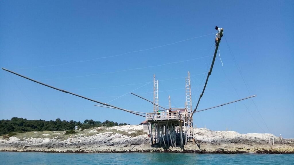 Viaggiando lungo la costa dell’adriatico che dall’Abruzzo scende sino al Gargano, è inevitabile che si venga rapiti alla vista di strani e maestosi manufatti in legno arroccati sugli scogli, dai quali fuoriescono lunghe antenne in legno, protese verso il mare, con grandi e penzolanti reti da pesca.