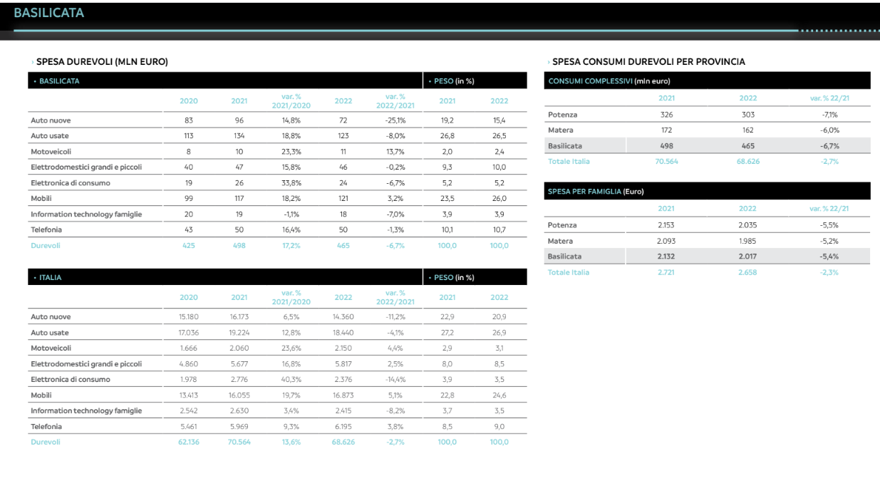 Nel 2022 – commenta Claudio Bardazzi, responsabile dell’Osservatorio Findomestic – la spesa media in beni durevoli per famiglia in Basilicata è stata di 2.017 euro, il 5,4% in meno rispetto al 2021. I lucani hanno speso meno in auto nuove, ma non è andata meglio per le usate (-8% per 123 milioni di euro) a differenza dei motoveicoli che hanno chiuso il 2022 con volumi di spesa in aumento del 13,7% (11 milioni complessivi). La spesa in elettrodomestici è rimasta sostanzialmente in linea con il 2021 (46 milioni), mentre per elettronica di consumo (TV e Hi-Fi, 24 milioni, -6,7%), telefonia (50 milioni, -1,3%) e information technology (18 milioni, -7%) il calo è stato più deciso. Anche nell’ultimo anno – conclude Bardazzi – i mobili hanno mantenuto alti livelli di spesa (121 milioni) confermando una crescita (+3,2%) su un 2021 che era già stato particolarmente positivo per il settore”.