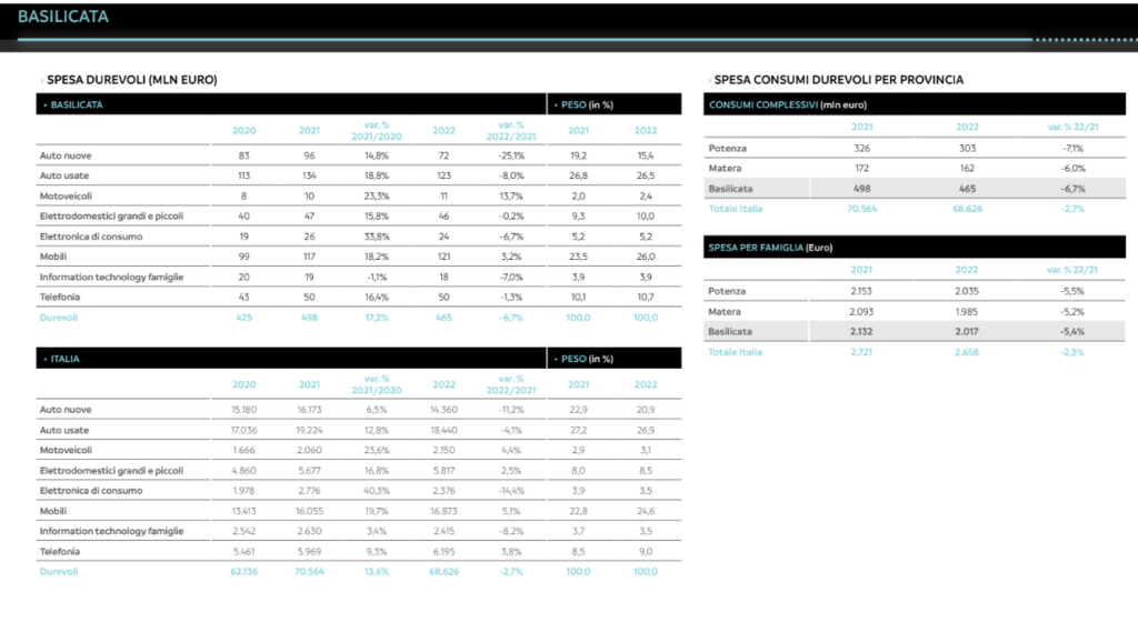 “Nel 2022 – commenta Claudio Bardazzi, responsabile dell’Osservatorio Findomestic – la spesa media in beni durevoli per famiglia in Basilicata è stata di 2.017 euro, il 5,4% in meno rispetto al 2021. I lucani hanno speso meno in auto nuove, ma non è andata meglio per le usate (-8% per 123 milioni di euro) a differenza dei motoveicoli che hanno chiuso il 2022 con volumi di spesa in aumento del 13,7% (11 milioni complessivi). La spesa in elettrodomestici è rimasta sostanzialmente in linea con il 2021 (46 milioni), mentre per elettronica di consumo (TV e Hi-Fi, 24 milioni, -6,7%), telefonia (50 milioni, -1,3%) e information technology (18 milioni, -7%) il calo è stato più deciso. Anche nell’ultimo anno – conclude Bardazzi – i mobili hanno mantenuto alti livelli di spesa (121 milioni) confermando una crescita (+3,2%) su un 2021 che era già stato particolarmente positivo per il settore”.