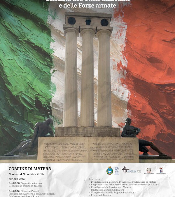 Martedì 4 novembre 2025, con inizio alle ore 10.00, si svolgerà in Piazza Vittorio Veneto a Matera la cerimonia per la Giornata dell’Unità Nazionale e delle Forze Armate, organizzata dalla Prefettura e dal Comando Provinciale Carabinieri di Matera. Presenzieranno alla cerimonia il Prefetto di Matera, Dott.ssa Cristina FAVILLI, le Autorità civili, militari e religiose, nonché rappresentanze delle Associazioni Combattentistiche e d’Arma. Nella circostanza, il Prefetto, accompagnato dalle citate Autorità, deporrà una corona al cippo di via Lucana e, successivamente, al Monumento ai Caduti di Piazza Vittorio Veneto, nel corso di una solenne cerimonia. Durante la celebrazione, sarà schierato un reparto di formazione composto da una rappresentanza delle Forze Armate, della Guardia di Finanza, dei Corpi di Polizia, della Croce Rossa Italiana, dei Vigili del Fuoco e delle Associazioni Nazionali dei Carabinieri e della Polizia di Stato; sarà inoltre data lettura dei messaggi inviati dal Capo dello Stato e dal Ministro della Difesa, e seguiranno gli interventi del Prefetto di Matera, Vicepresidente della Regione Basilicata, Sindaco del Comune di Matera, Presidente della Provincia di Matera, delle Associazioni Combattentistiche e d’Arma e dei rappresentanti della Consulta Studentesca.