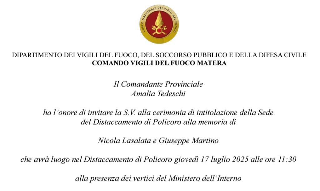 Il 17 luglio p.v., a un anno dalla tragica scomparsa dei vigili del fuoco Giuseppe Martino e Nicola Lasalata si svolgerà la cerimonia di intitolazione del Distaccamento dei Vigili del Fuoco di Policoro e di una piazza a Nova Siri Scalo
