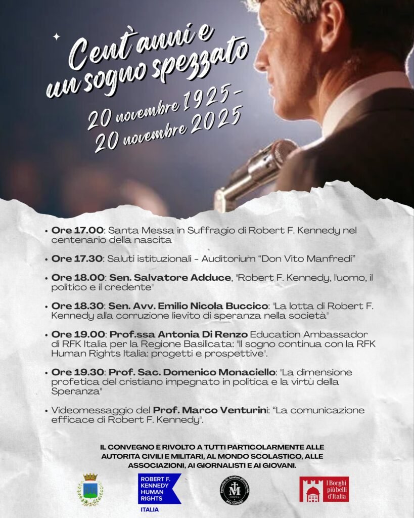 Nell’anno giubilare un convegno nell’Auditorium “don Vito Manfredi” di Irsina per celebrare nel giorno del centenario della nascita un “testimone di speranza”: R. Kennedy: sposo, padre di una numerosa famiglia, politico cattolico. Il pomeriggio di domani, 20 Novembre, inizierà alle 17:00 con la Celebrazione Eucaristica in suffragio di R. Kennedy nella Parrocchia SS. Salvatore all’Immacolata presieduta dal Parroco Sac. Giuseppe Calabrese che continua a costruire ponti umani con i cittadini Irlandesi e americani che nel corso dell’anno vivono o frequentano per brevi periodi il borgo Lucano.