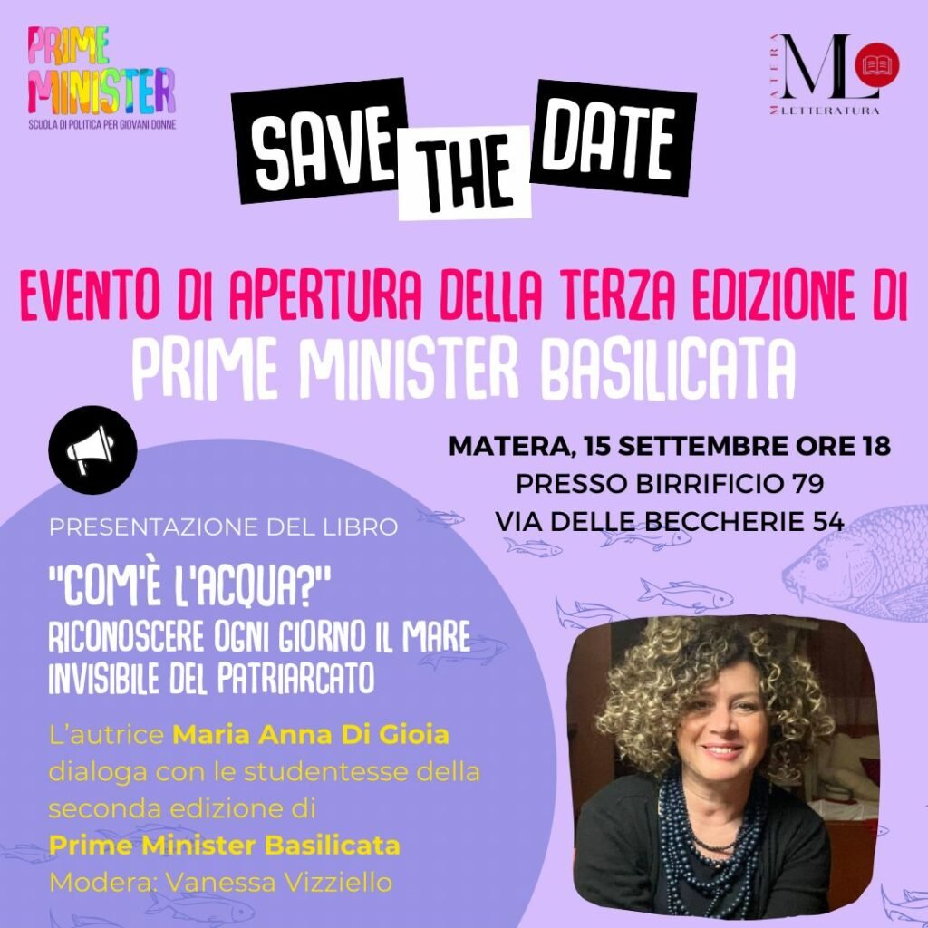 Si terrà venerdì 15 settembre 2023, alle 18.00, al Birrificio 79, in Via delle Beccherie, 54 a Matera, l’anteprima della terza edizione lucana di Prime Minister Basilicata, la scuola di politica per giovani donne sostenuta dall’associazione di promozione sociale Matera Letteratura. Ospite la scrittrice Maria Anna Di Gioia, autrice del volume “Com’è l’acqua?”. Riconoscere ogni giorno il mare invisibile del patriarcato, Settenove edizioni. Modererà l’incontro Vanessa Vizziello, componente di Prime Minister Basilicata.