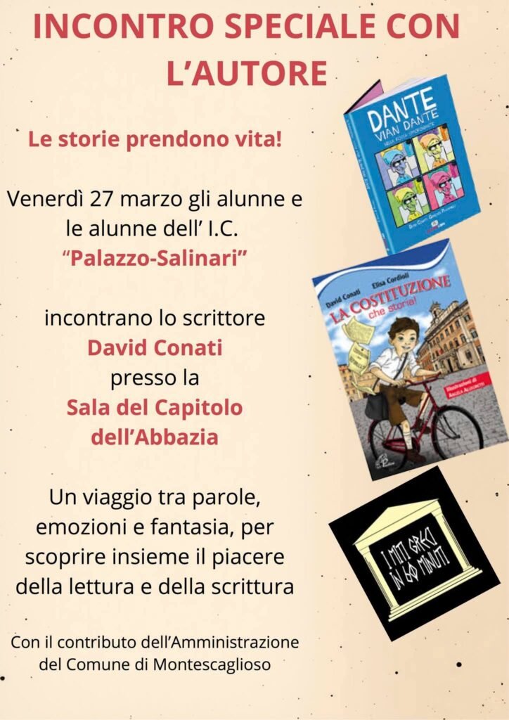 Si comunica che, in occasione del Festival della Letteratura e del Libro, venerdì 27 marzo, presso la Sala del Capitolo dell’Abbazia Benedettina, si terrà un incontro con l’autore David Conati, compositore, traduttore e scrittore di narrativa per ragazzi.