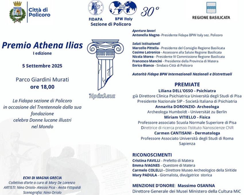 Si volgerà venerdì 5 settembre alle 18 nei Giardini Murati di Policoro (MT) il Premio Athena Ilias 2025. L’evento, promosso in occasione del trentennale della sezione Fidapa BPW Italy di Policoro, intende celebrare le eccellenze femminili lucane.