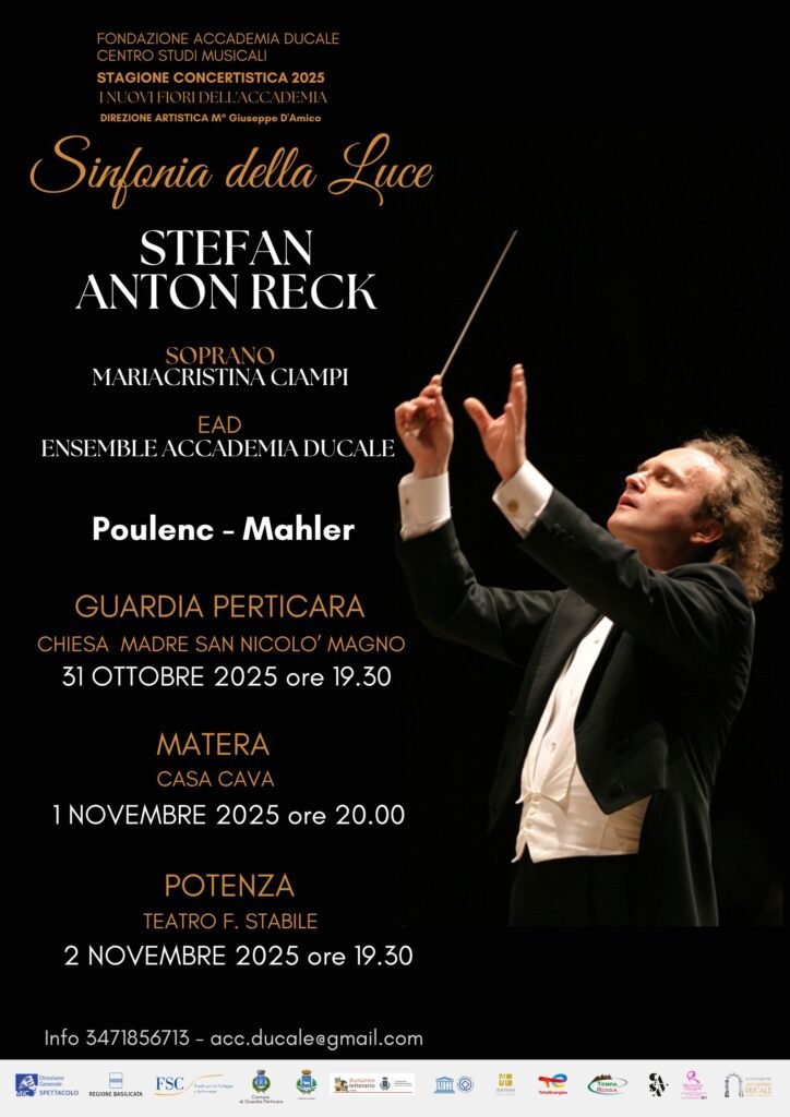 Fino al 2 novembre la Basilicata si trasforma in un palcoscenico internazionale con il progetto “Mahler in Basilicata”. Protagonisti il Maestro Stefan Anton Reck, figura di spicco della musica sinfonica europea e l’Ensemble Accademia Ducale, centro studi musicali con diverse sedi in Basilicata. Un ritorno atteso e fortemente simbolico: dopo una lunga assenza dall’Italia, Reck torna scegliendo proprio la Basilicata per un viaggio musicale che intreccia musica, storia e identità culturale in un percorso di rara suggestione. Al centro di questo viaggio, la Sinfonia No. 4 di Gustav Mahler, proposta nella raffinata versione da camera di Iain Farrington, autore delle musiche eseguite per l’incoronazione di Re Carlo III. Un’opera che guarda al cielo attraverso lo sguardo innocente dell’infanzia e che, tra le pietre millenarie e le architetture dei borghi lucani, troverà una risonanza particolarmente intensa.