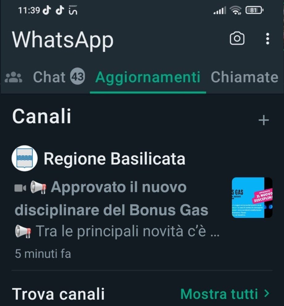 Dopo l’iscrizione al servizio il Canale Regione Basilicata comparirà nella scheda Aggiornamenti, in precedenza scheda Stato di WhatsApp.